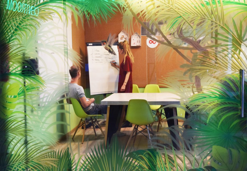 15-metrowa, zaciszna salka konferencyjna, przeznaczona maksymalnie dla 10-12 osób. Szklane drzwi z relaksującym motywem egzotycznego lasu, oddzielają ją od przestrzeni typu open space. Ogromne okno wychodzi na pełną energii ulicę Sienkiewicza.